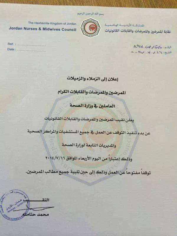 أعلن نقيب الممرضين محمد حتاملة بداية اضراب العاملين في النقابة عن العمل في كل مواقع عملهم، بحسب تعميم اطلعت عليه "عمّان نت".