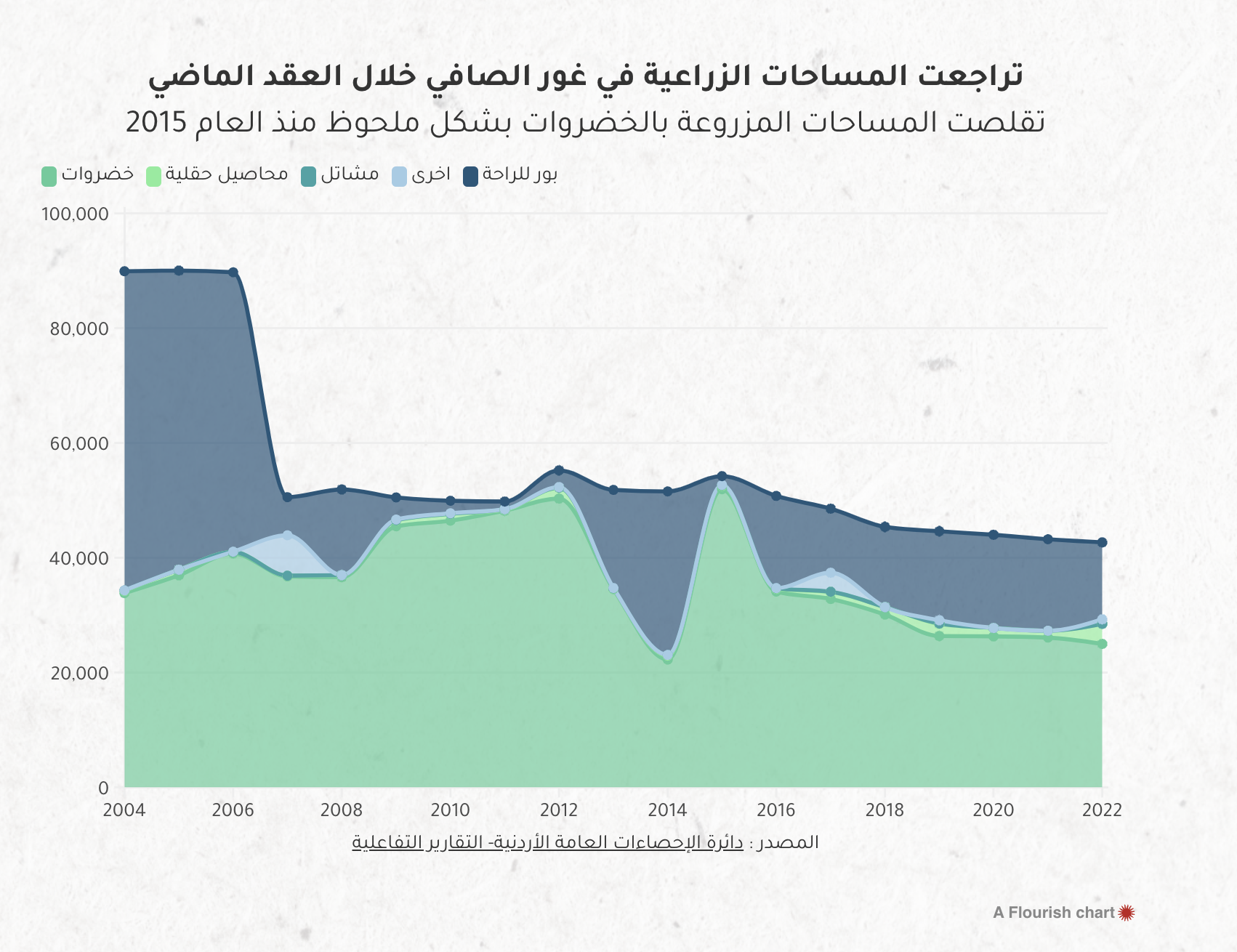 يكشف تحليل بيانات دائرة الإحصاءات العامة الأردنية عن تراجع الأراضي الزراعية في غور الصافي، بنحو 38 في المئة خلال العقد الماضي. تبدو زراعة الخضروات الأكثر تأثراً بذلك، إذ تناقصت المساحات المزروعة بتلك المحاصيل إلى النصف تقريباً في تلك الفترة، في ظل تزايد الأراضي البور إلى نحو ست مرات؛ إلا أن بيانات دائرة الإحصاءات العامة أشارت إلى أن هذه الأراضي تركت فقط للراحة.