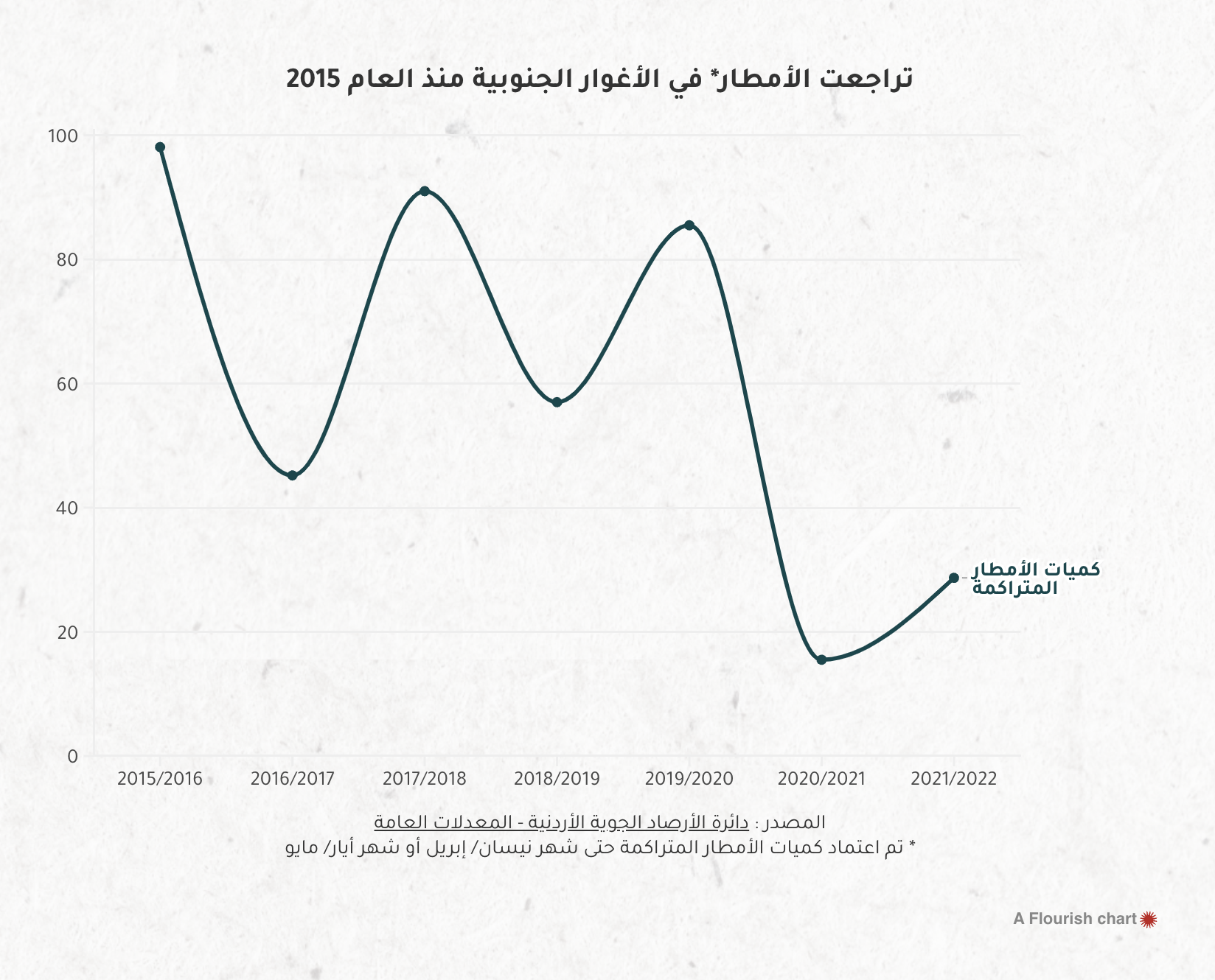 يُعدّ الأردن من أكثر الدول عرضة للجفاف الناجم عن التغيرات المناخية، وفق منظمة الأمم المتحدة. شهدت الأغوار الجنوبية تراجعاً في هطول الأمطار خلال السنوات الأخيرة؛ حيث تراجع أداء الموسم المطري في غور الصافي بنسبة 70 في المئة بين عام 2015 و2020، بحسب بيانات دائرة الأرصاد الجوية.