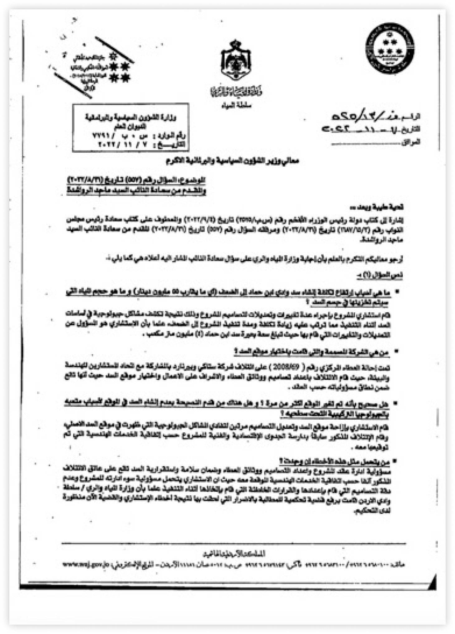في رد على استجواب قدّمه النائب ماجد الرواشدة عام 2022، إلى وزارة المياه والري، حمّلت الوزارة الائتلاف الاستشاري، الذي أُحيل إليه عطاء سد ابن حماد، مسؤولية سوء الإدارة، وعدم دقة التصاميم والقرارات الخاطئة، التي اتخذت أثناء التنفيذ.