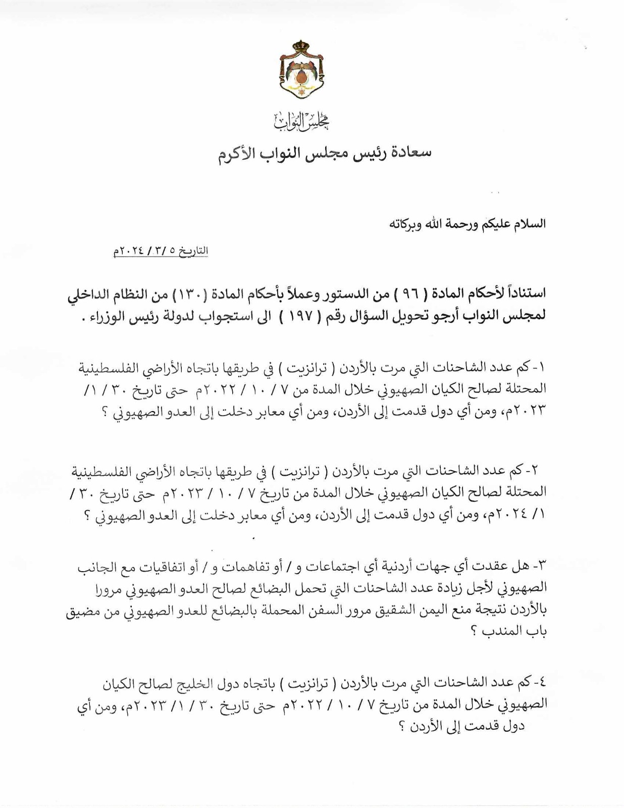 حول النائب حسن الرياطي سؤاله النيابي الموجه إلى رئيس الوزراء إلى استجواب، حيث تساءل الرياطي عن عدد الشاحنات التي مرت بالأردن (ترانزيت) إلى الأراضي الفلسطينية المحتلة او ما يعرف اعلاميا بـ"الجسر البري" منذ السابع من تشرين الأول من العام 2022 إلى الثلاثين من كانون الثاني من عام 2023، وعن عددها في نفس الفترة الزمنية ما بين العامين 2023 و 2024.