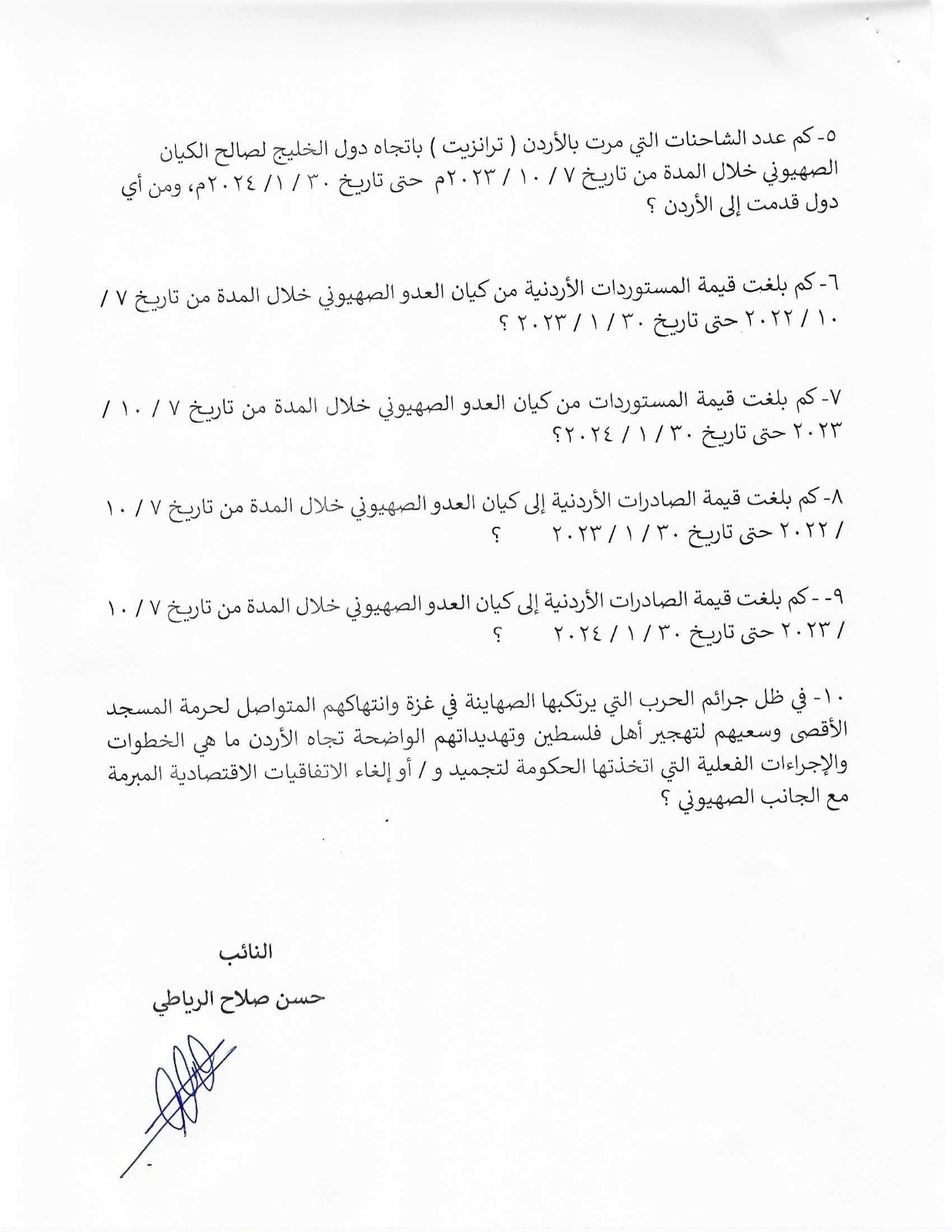 واستفسر الرياطي عن وجود "جهات أردنية" عقدت اجتماعات و/أو تفاهمات و/أو اتفاقيات مع الجانب الصهيوني لأجل زيادة عدد الشاحنات التي تحمل البضائع لصالح العدو الصهيوني مرورا بالأردن.