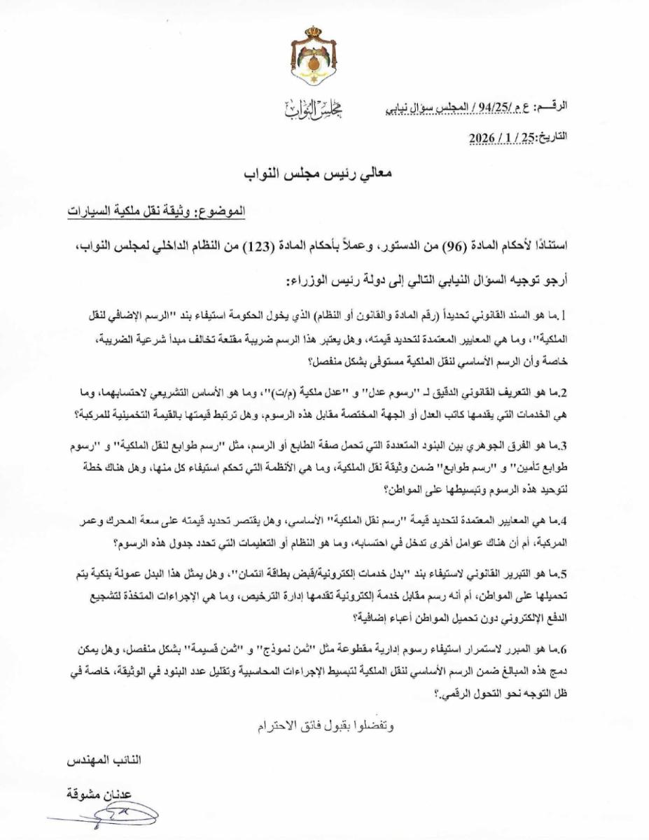 وجه النائب المهندس عدنان مشوقة سؤالاً نيابياً إلى دولة رئيس الوزراء، طالب فيه الحكومة بتوضيح تفاصيل بنود وثيقة نقل ملكية المركبات، وتعدد وتنوع الرسوم المالية المرتبطة بها، مستندًا إلى أحكام الدستور والنظام الداخلي لمجلس النواب.