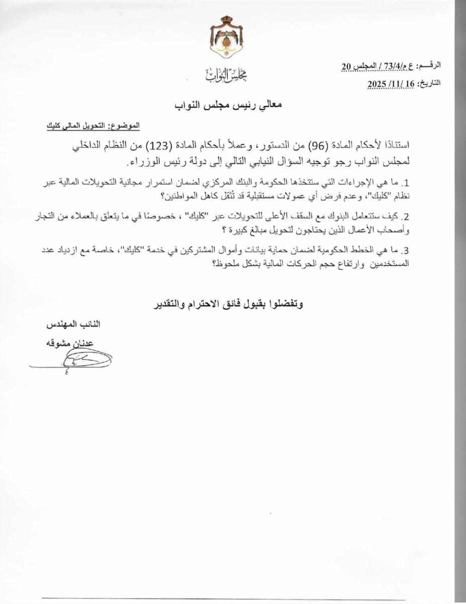 قدّم النائب عدنان مشوقة سؤالًا نيابيًا لدولة رئيس الوزراء حسان، استنادًا لأحكام المادة (96) من الدستور والمادة (123) من النظام الداخلي لمجلس النواب، طالب فيه بتوضيحات رسمية حول مستقبل خدمة التحويلات الفورية "كليك" التي يعتمد عليها مئات الآلاف من الأردنيين يوميًا.