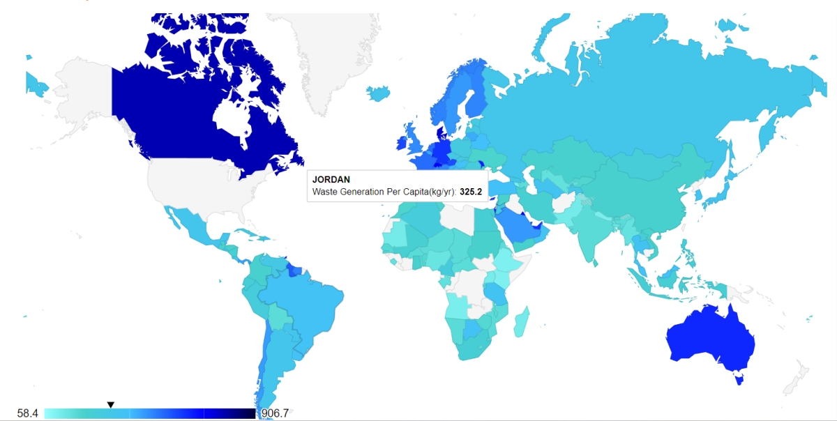 توضح الخريطة التفاعلية أدناه معدل إنتاج الفرد الواحد (كغم /سنة) متوسط كمية النفايات الصلبة التي يتم إنتاجها سنويًا للشخص الواحد.
