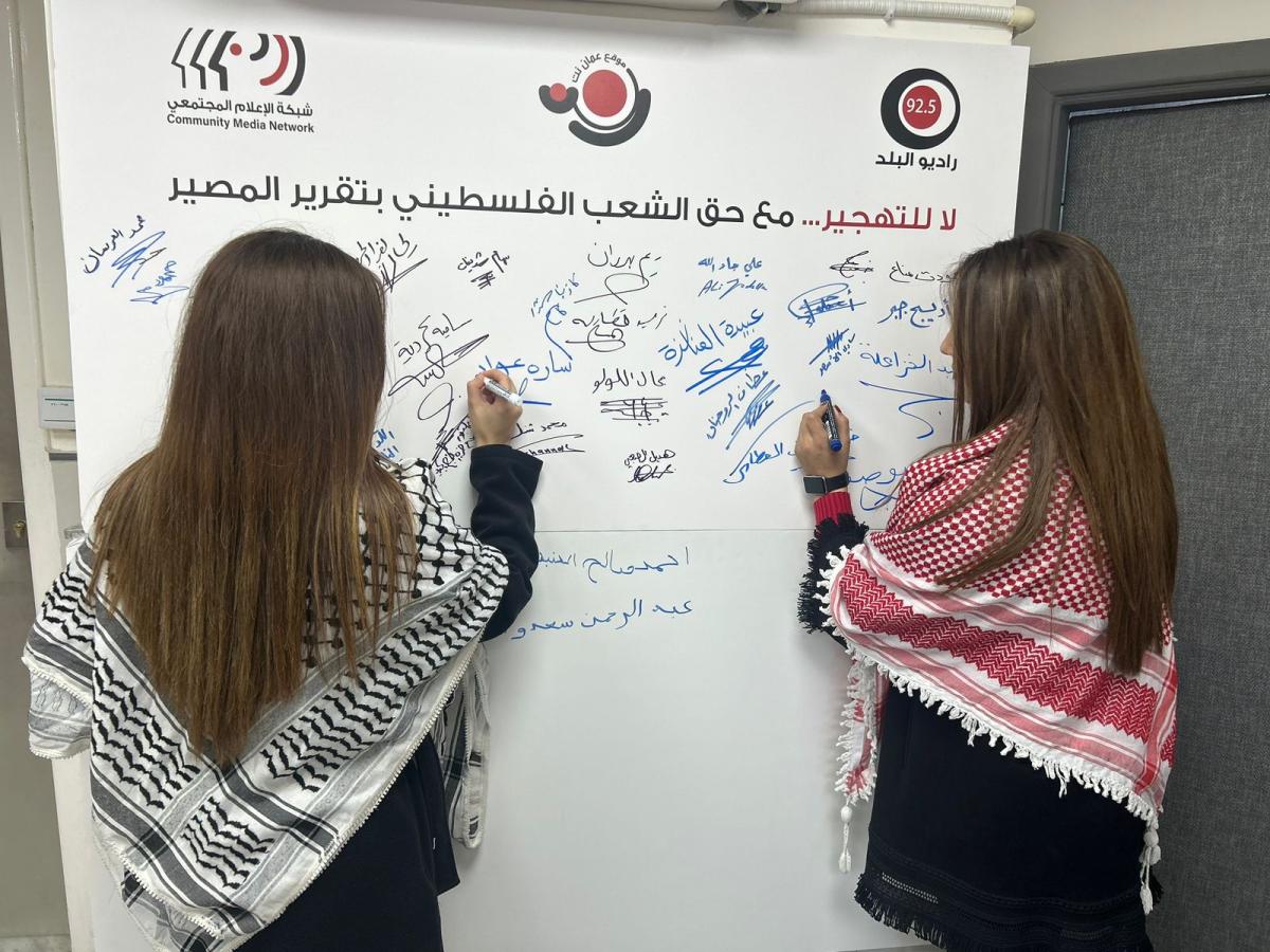 وقالت مديرة راديو البلد عطاف الروضان إن "الحملة ستستضيف بموجة مفتوحة مجموعة من الشخصيات العامة في مجالات مختلفة للتأكيد على رفض التهجير"، مضيفة "دعمنا لهذا الموقف الرسمي يعكس التزامنا بالحقوق العادلة للشعب الفلسطيني، ويعزز من دور الإعلام المجتمعي في الدفاع عن القضايا الوطنية والقومية. إننا ندعو جميع المواطنين للمشاركة في هذه الحملة والتعبير عن رفضهم للسياسات التي تهدف إلى تهجير الشعب الفلسطيني وتقويض حقوقه بإقامة دولة فلسطينية".
