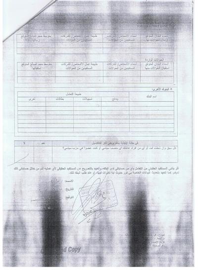 تلزم البنوك عملائها من المواطنين بضرورة الإفصاح عن انتمائهم الحزبي وإقرار وتعهد بضرورة عدم استفادة تلك الأحزاب أو ما تعتبره البنوك في وثيقة إلزامية مقرة من البنك المركزي بضرورة عدم استفادة الهيئات لصالح أي عمل مسلح، وذلك من خلال نماذج التعبئة التي يقدمها الموظف من المتقدم لفتح حساب شخصي أو إعادة تفعيل حسابه من جديد.