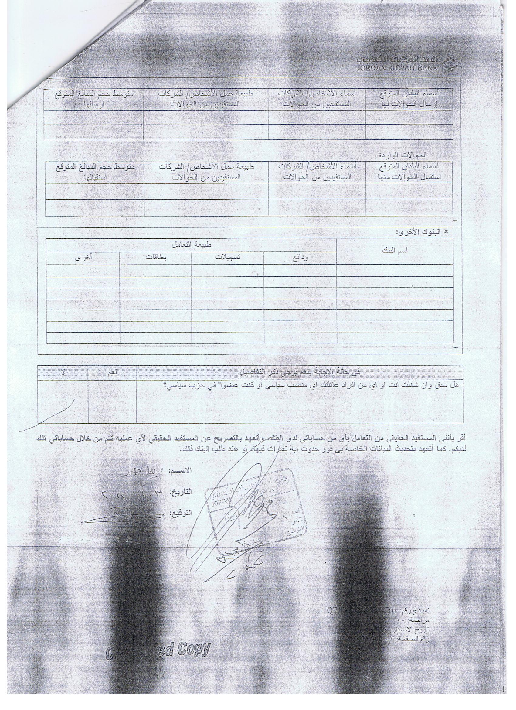 يلزمك عزيزي المواطن قبل الذهاب إلى البنك الاردني الكويتي الإفصاح عن انتمائك السياسي ولأي حزب تتبع، أكنت أنت أو أحد أفراد عائلتك؛ ذلك السؤال ليس طلبا للدخول في عضوية حزب أو تيار سياسي إنما طلب بنكي إجباري لأي مواطن يرغب بفتح حساب بنكي.