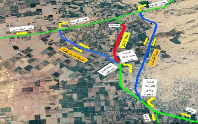 وأضافت الوزارة، أنه سيتم تحويل السير باتجاه جسر الملك حسين والشونة الجنوبية بحيث يتم استخدام الطريق الموازي لقناة الملك عبدالله – محطة محروقات الاغوار وحسب الشواخص المبينة في الموقع، وسيتم تحويل السير القادم من السلط وادي شعيب باتجاه عمان – الرامة بحيث سيتم استخدام طريق الجواسرة من مثلث مستشفى الشونة الجنوبية، فيما سيتم تحويل السير القادم من الكرامة وجسر الملك حسين باتجاه عمان –الكفرين – الرامة، بحيث يتم استخدام الطريق الموازي لقناة الملك عبدالله.