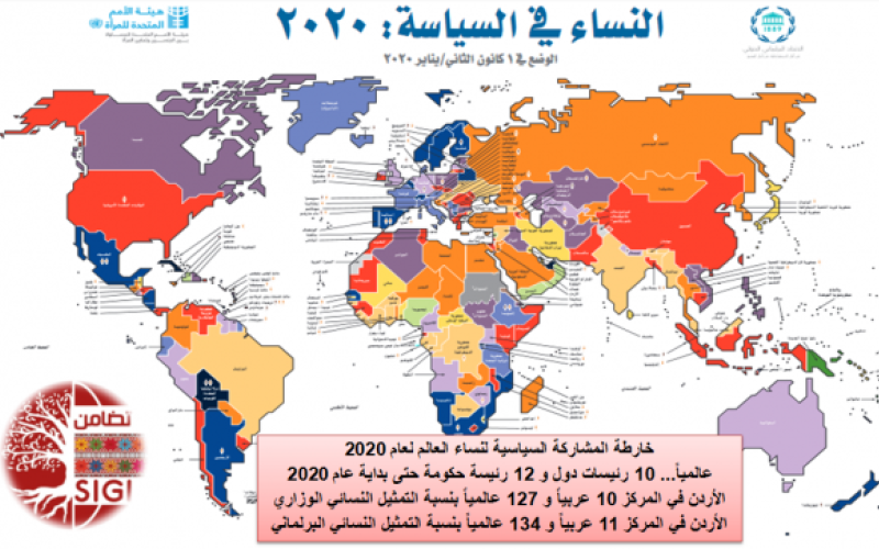 وقد أصدرت هيئة منظمة الأمم المتحدة المعنية بالمساواة بين الجنسين وتمكين المرأة والإتحاد البرلماني الدولي خارطة المشاركة السياسية للنساء في العالم لعام 2020، والتي تعكس الوضع القائم عالمياً حتى تاريخ 1/1/2020 ، وتشمل معظم الدول. وتركز الخارطة على مشاركة النساء في رئاسة الدول والحكومات، وفي تولي المناصب الوزارية وعضوية البرلمانات خاصة المنتخبة منها.