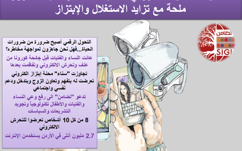 وتشير جمعية معهد تضامن النساء الأردني "تضامن" الى أن التحول الرقمي أصبح ضرورة من ضروريات الحياة، لكن هل نحن جاهزون له في مواجهة مخاطره؟ بالتأكيد ليس بالصورة المأمولة وذلك لعدة أسباب من بينها سوء أو ضعف البنية التحتية التي تتيح الوصول السهل وذو الكلفة البسيطة لكافة وسائل التكنولوجيا، وبسبب ضعف القدرة على إستخدام التكنولوجيا خاصة للنساء وكبيرات السن تحديداً، وبسبب تزايد إنتشار أنواع مختلفة من العنف الالكتروني ضد النساء والفتيات والطفلات، ومن أكثرها شيوعاً المطاردة والملاحقة الإلكترونية، والإبتزاز الإلكتروني، والتحرشات الجنسية الإلكترونية، والمراقبة والتجسس على أجهزة الحاسوب، والإستخدامات غير القانونية بإستخدام التكنولوجيا والإنترنت للصور ومقاطع الفيديو وتحريفها والتهديد بها، والإتجار بالبشر للإستخدامات الجنسية غير المشروعة ، وإنتحال أسماء وشخصيات معروفة للإيقاع بالنساء والفتيات والطفلات خاصة في غرف الدردشة وغيرها الكثير.