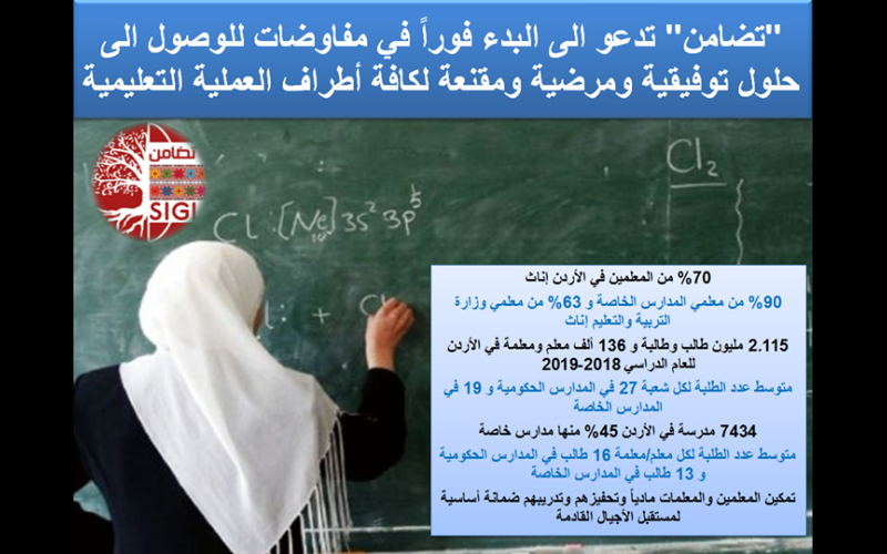 وتجد "تضامن" بأن لغة الحوار والتفاوض هي أسلم الطرق لحل كافة الإشكاليات والقضايا والمطالب التي ينادي بها المعلمون والمعلمات، كما أنها أفضل الوسائل للوصول الى تفاهمات تراعى فيها مصالح الجميع دون محاباة، ليتمكن الطلاب والطالبات من دخول العام الدراسي القادم بآمان وفي جو يسوده الإحترام بين كافة أطراف العملية التعليمية.