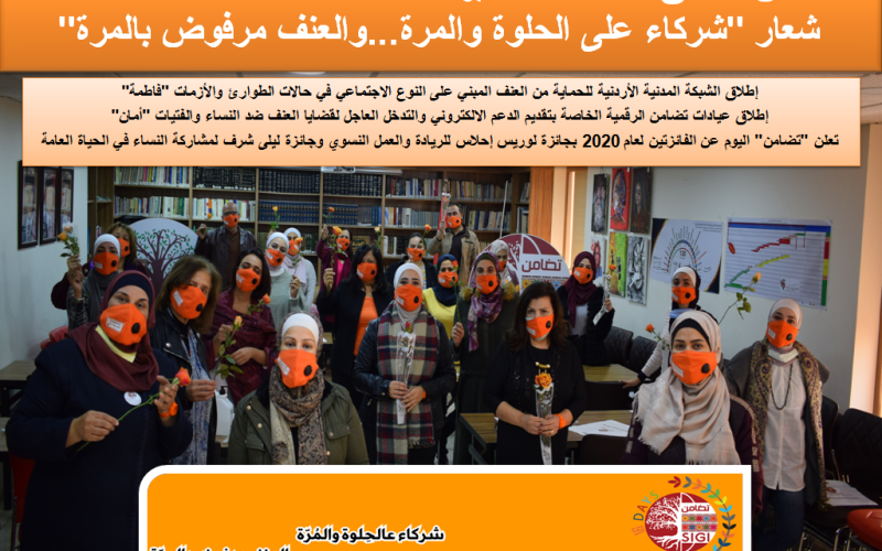 وتشير جمعية معهد تضامن النساء الأردني "تضامن" الى الحملة الوطنية في الأردن لهذا العام والتي تحمل رسالة "نحن معكم ضد العنف"، فيما تطلق "تضامن" حملتها تحت شعار "شركاء على الحلوة والمرة... والعنف مرفوض بالمرة" في إطار "مناهضة العنف ضد النساء والفتيات في الأردن". كما تدعو "تضامن" الأردن للمصادقة على اتفاقية القضاء على العنف والتحرش في عالم العمل (اتفاقية منظمة العمل الدولية رقم 190).