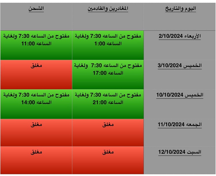 نشرت إدارة أمن الجسور في مديرية الأمن العام تعديلا على أوقات عمل جسر الملك حسين، لأيام محددة خلال النصف الأول من شهر تشرين الأول لعام 2024.