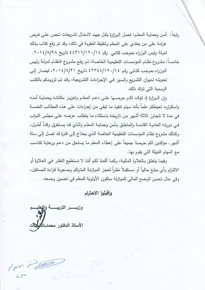 أعلن نقيب المعلمين حسام المشة تعليق إضراب المعلمين ابتداء من يوم الأحد.