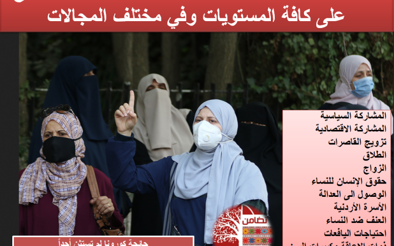 تقول جمعية معهد تضامن النساء الأردني "تضامن" بأن النساء الأردنيات لعبن دوراً محورياً في صمود الأردن في مواجهة جائحة كورونا وتداعياتها خلال عام 2020، وأن هذا الدور كان له آثاراً مباشرة في مختلف المراحل وعلى كافة المستويات خاصة الصحية والتعليمية والأسرية. وتحملت النساء الكلفة العالية تبعاً لذلك طالت كافة المجالات، فخسرت العديد منهن وظائفهن ومصادر دخلهن، وتضاعفت الأعباء المنزلية والرعائية والتعليمية والوظيفية، وتحملن وصمتن على العنف الممارس ضدهن من قبل بعض الأزواج أو الآباء أو الأخوة حفاظاً على أسرهن وأطفالهن من جهة، وإيماناً منهن بأن المرحلة الحالية استثنائية تخللتها ضغوطات مالية بسبب ارتفاع معدلات البطالة والفقر وتراجع الأعمال من جهة ثانية.