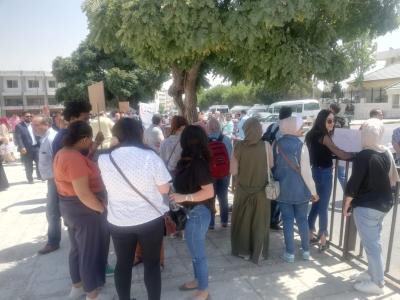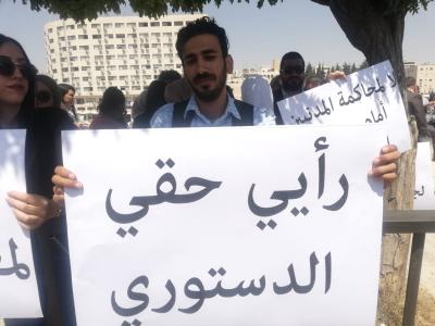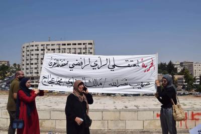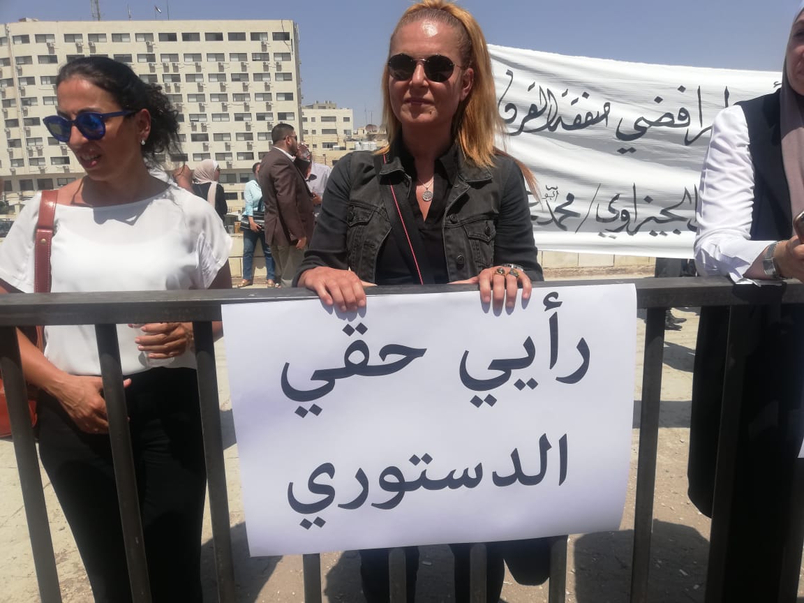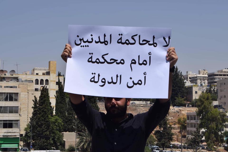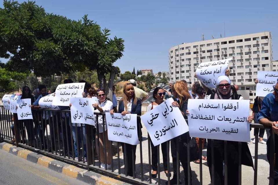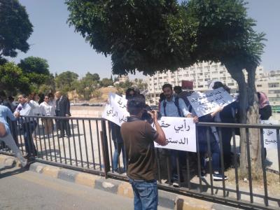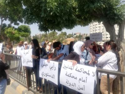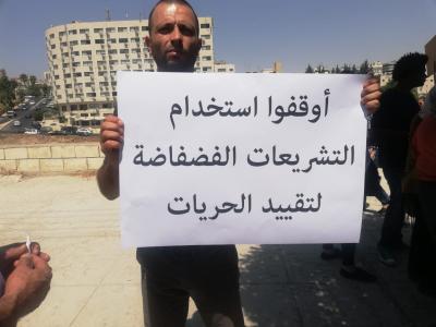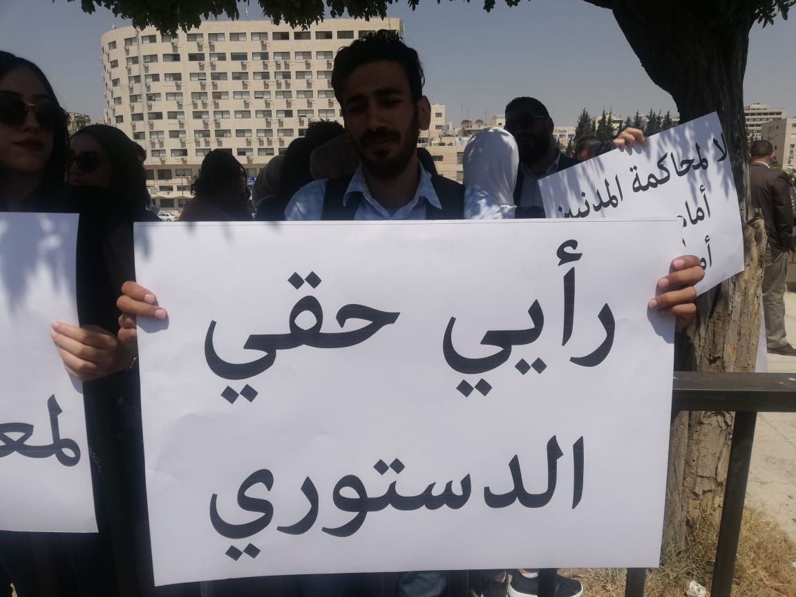 وحمل المعتصمون يافطات كتب عليها ،"أوقفوا استخدام المواد الفضفاضة ولا لمحاكمة المدنيين أمام محكمة أمن الدولة ، والحرية لمعتقلي الرأي " .