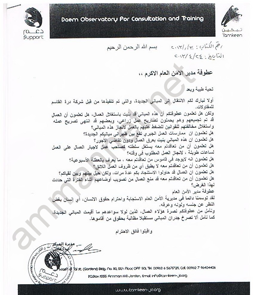وجه مركز دعم لحقوق الإنسان كتابا رسميا إلى مدير الامن العام يطلعه فيه على ما تعرض له قرابة 60 عاملا مصريا يعملون على بناء المباني الجديدة للأمن العام.
