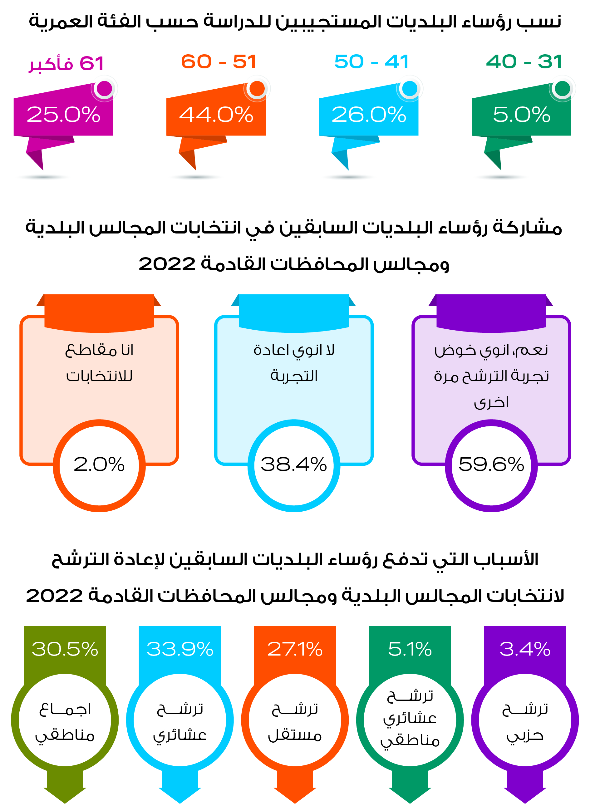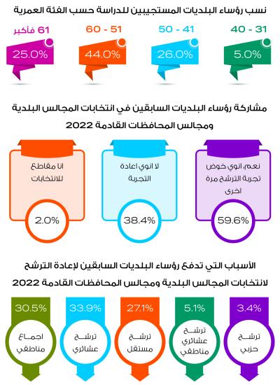 استكمالاً لمراقبة انتخابات المجالس البلدية ومجالس المحافظات 2022، نفذ مركز الحياة – راصد دراسة حول توجهات رؤساء البلديات السابقين لانتخابات المجالس البلدية ومجالس المحافظات، حيث استمرت الدراسة خلال الفترة (25/1/2022-02/02/2022) واستهدفت الدراسة جميع رؤساء البلديات السابقين حيث تفاعل معها بشكل كامل 96 رئيس بلدية سابق و3 بشكل جزئي وأحد الرؤساء السابقين توفاه الله، وتبين أن 59 رئيس بلدية سابق سيترشح لانتخابات الادارة المحلية القادمة، بينما كان 40 رئيس بلدية سابق لن يترشحوا للانتخابات المقبلة.