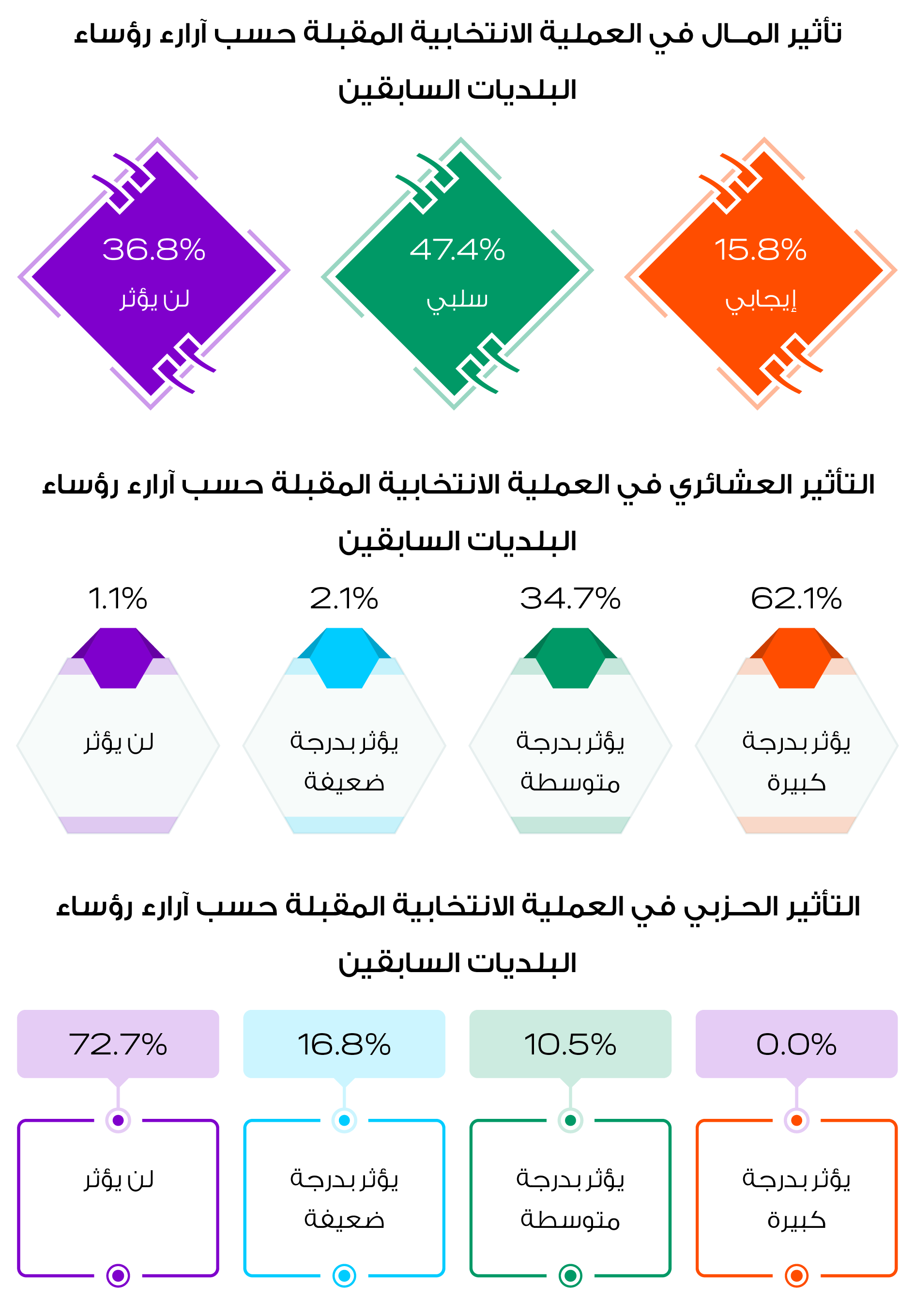 وبالسؤال عن تأثير الأحزاب في العملية الانتخابية المقبلة، أظهرت النتائج أن ما نسبته 72.7% من رؤساء البلديات السابقين يرون أن الاعتبار الحزبي لن يؤثر في توجهات المواطنين، و16.8% يرون أن الاعتبار الحزبي يؤثر بدرجة ضعيفة، فيما بينت ما نسبته 10.5% بأن الاعتبار الحزبي سيؤثر بدرجة متوسطة في العملية الانتخابية المقبلة.