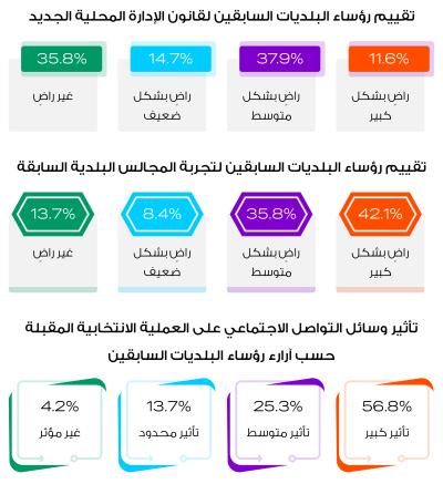 وفي خصوص تقييم أداء المجالس البلدية السابقة، فقد تبين أن 42.1% من الرؤساء السابقين للبلديات راضين بشكل كبير عن أداء المجالس، و35.8% قالوا بأنهم راضين بشكل متوسط، 13.7% غير راضين نهائياً، فيما تبيّن أن 8.4% منهم راضين بشكل ضعيف عن أداء المجالس البلدية السابقة.