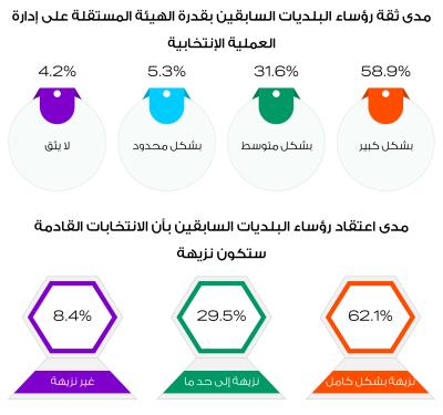 وعن مدى ثقة رؤساء البلديات السابقين بقدرة الهيئة المستقلة للانتخاب على إدارة العملية الانتخابية، بينت النتائج أن ما نسبته 58.9% يثقون بدرجة كبيرة، و31.6% يثقون بدرجة متوسطة، و5.3% يثقون بدرجة محدودة، بينما بينت النتائج أن 4.2% لا يثقون بقدرة الهيئة المستقلة للانتخاب على إدارة العملية الانتخابية.