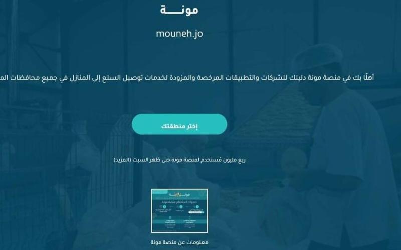 أطلقت الحكومة، السبت، منصة مونة الإلكترونية، وهي دليل للشركات والتطبيقات المُرخصة والمُزودة لخدمات توصيل السلع إلى المنازل في جميع محافظات المملكة.