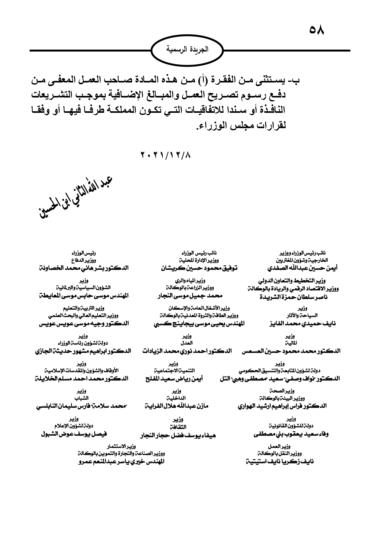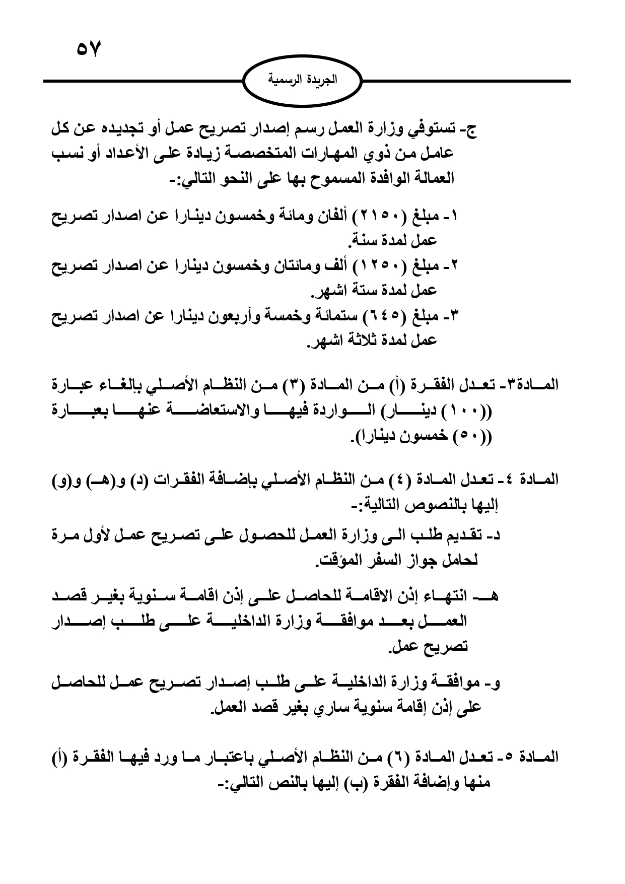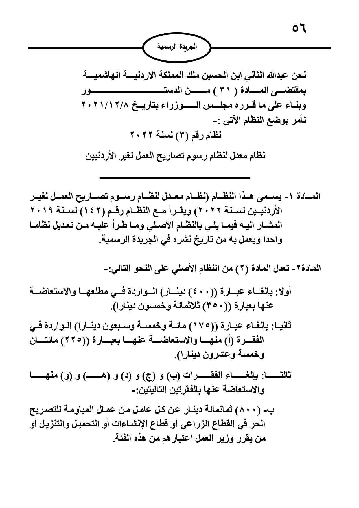 صدر في الجريدة الرسمية اليوم الأحد،  نظام معدل لنظام رسوم تصاريح العمل لغير الأردنيين.