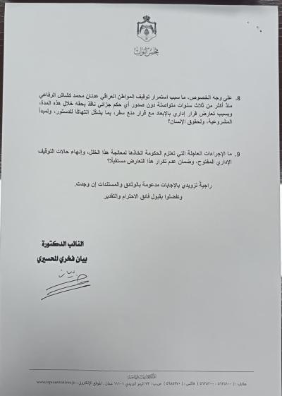 وجهت النائب بيان فخري المحسيري سؤالاً نيابياً إلى وزير الداخلية، استناداً لأحكام المادة (96) من الدستور وعملاً بأحكام المادة (123) من النظام الداخلي لمجلس النواب، تمحور حول قضية "التوقيف الإداري" وما يرافقها من تعارض قانوني وإنساني.