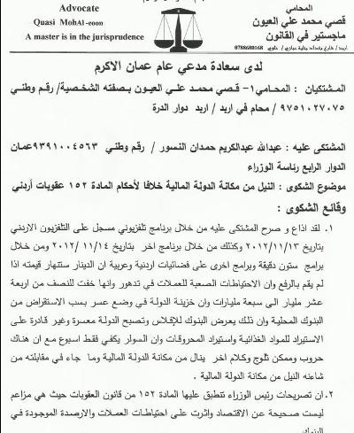 واستمع مدعي عام عمان محمد الصوراني الى المشتكيين المحاميين عدي السبع وقصي العيون كشهود للحق العام حيث قال المحامي عدي السبع ان تصريحات رئيس الوزراء عبد الله النسور الأخيرة التي أدلى بها على شاشات التلفزيون وموضوعها النيل من مكانة الدولة المالية خلافاً لأحكام المادة 152 من قانون العقوبات الأردني من شأنها الأضرار بالاقتصاد الأردني والتهديد بانهيار الدينار الأردني في حال عدم زيادة الأسعار على الكهرباء وكان كلامه ينال من مكانة الدولة الأقتصادية وتم إذاعة هذه التصريحات حسب ما ينطبق على المادة 73 من قانون العقوبات الأردني حيث تمت بوسائل الأعلام جهراً وحيث أن تصريحات المشتكى عليه عبد الله النسور غير صحيحة ومن شأنها الأضرار بالاقتصاد الاردني وأن المشتكى عليه قد سبب ضرر بتصريحاته عن شركة الكهرباء، حيث نفى الخبراء والمحللون الاقتصاديون بالوثائق والأدلة تصريحات رئيس الوزراء غير الصحيحة