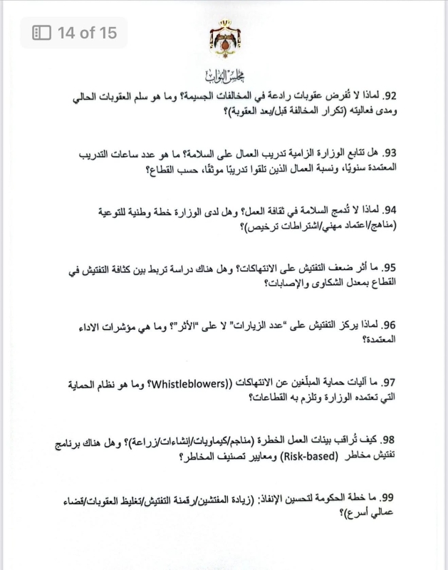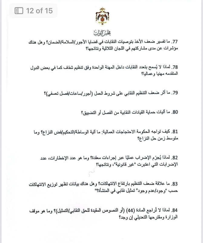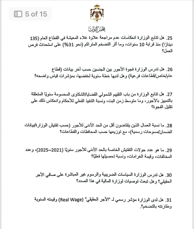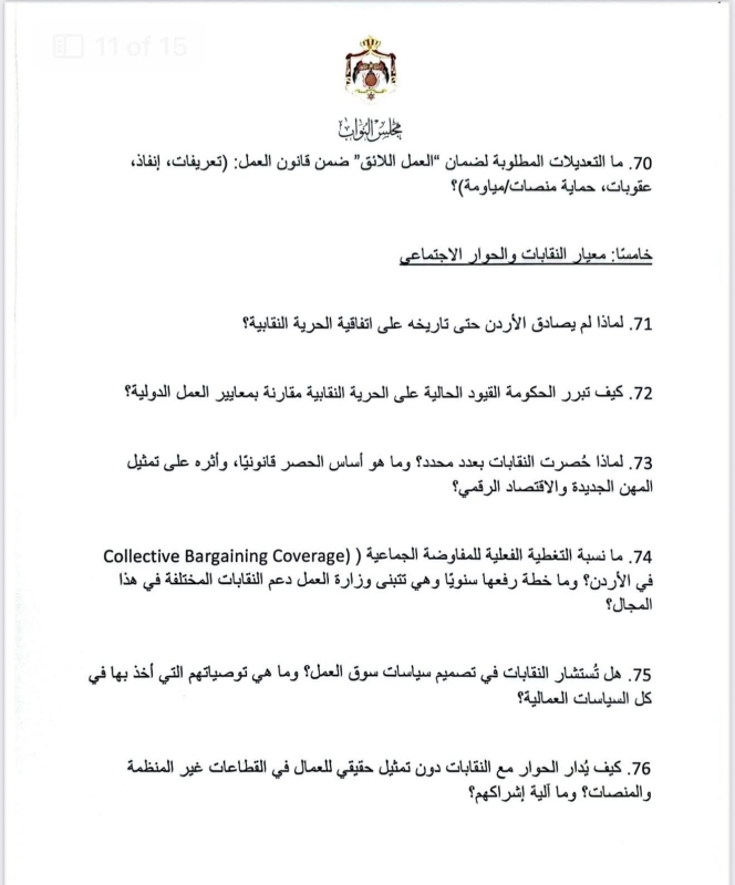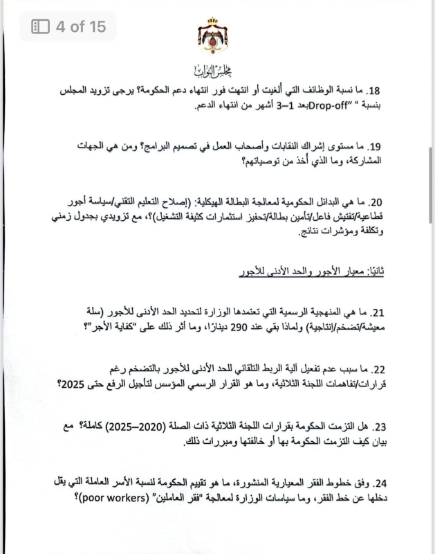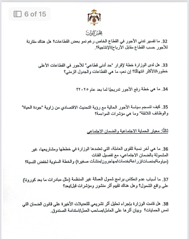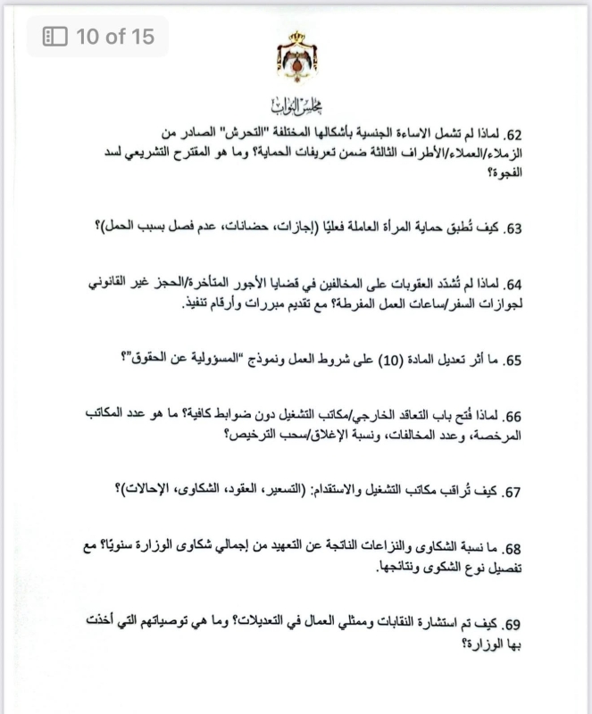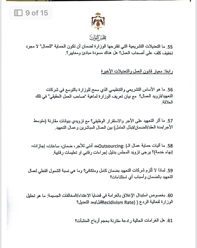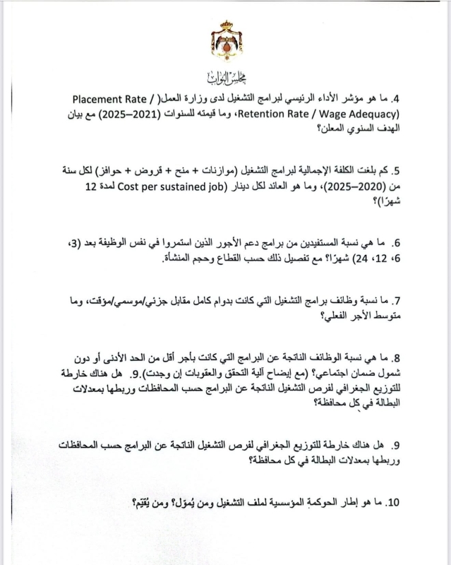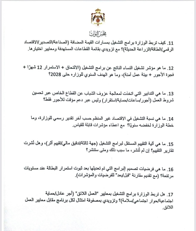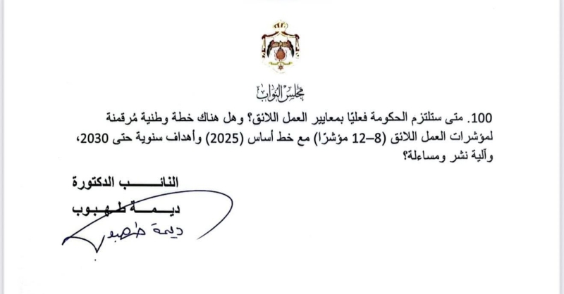 في أطول استجواب يشهده مجلس النواب الأردني، قدّمت النائب ديمة طهبوب استجواباً مكوّناً من 100 سؤال استجوابي موجّه لوزارة العمل، حول تطبيق معايير العمل اللائق في الأردن.