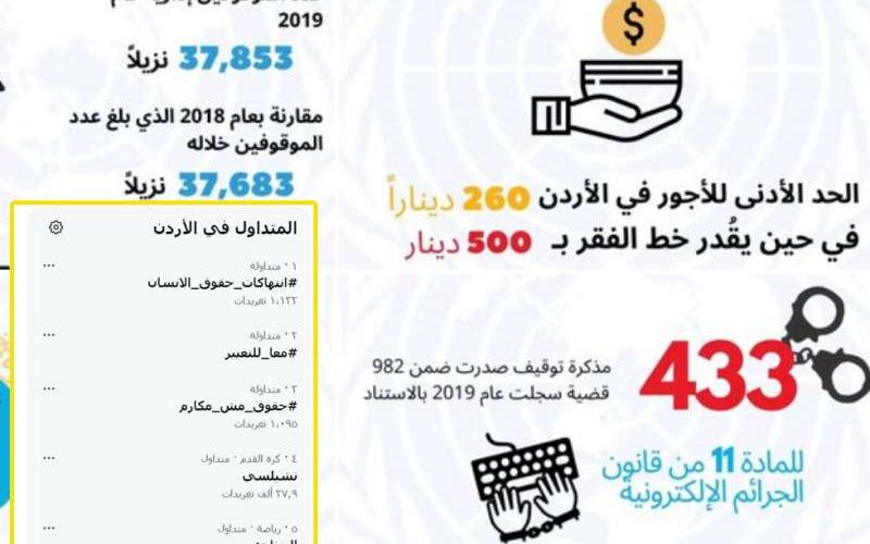 تصدرت وسوم #معا_للتغيير و #انتهاكات_حقوق_الانسان و #حقوق_مش_مكارم قائمة الأكثر تداولا في الأردن، السبت، وذلك بعد تخصيص مركز حماية وحرية الصحفيين هذين الوسمين للتغريد بهما ضمن فعاليات العاصفة الالكترونية التوعوية للدفاع عن حقوق الانسان في الأردن.