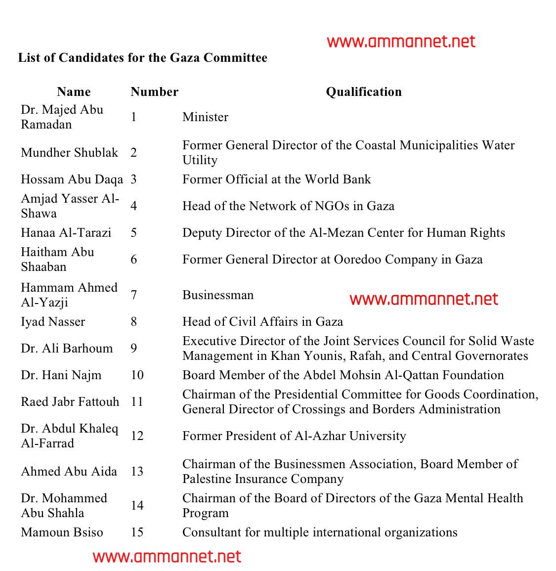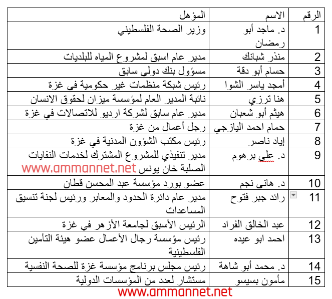 علمت عمان نت من مصدر رفيع المستوى من حركة فتح في فلسطين أنه "تم التوافق على القائمة التالية للجنة المقترحة من السلطة الفلسطينة التي ستدير قطاع غزة في الفترة الأولى للمشروع المصري لإعادة إعمار غزة. واللجنة مشكلة من 15 شخصية من التكنوقراطيين غير منتمين لأي حزب أو تنظيم، وحسب المصادر تأتي هذه الأسماء بالتشاور مع أطراف عربية ودولية، وقد تصدر القائمة بمرسوم رئاسي من الرئيس الفلسطيني محمود عباس.