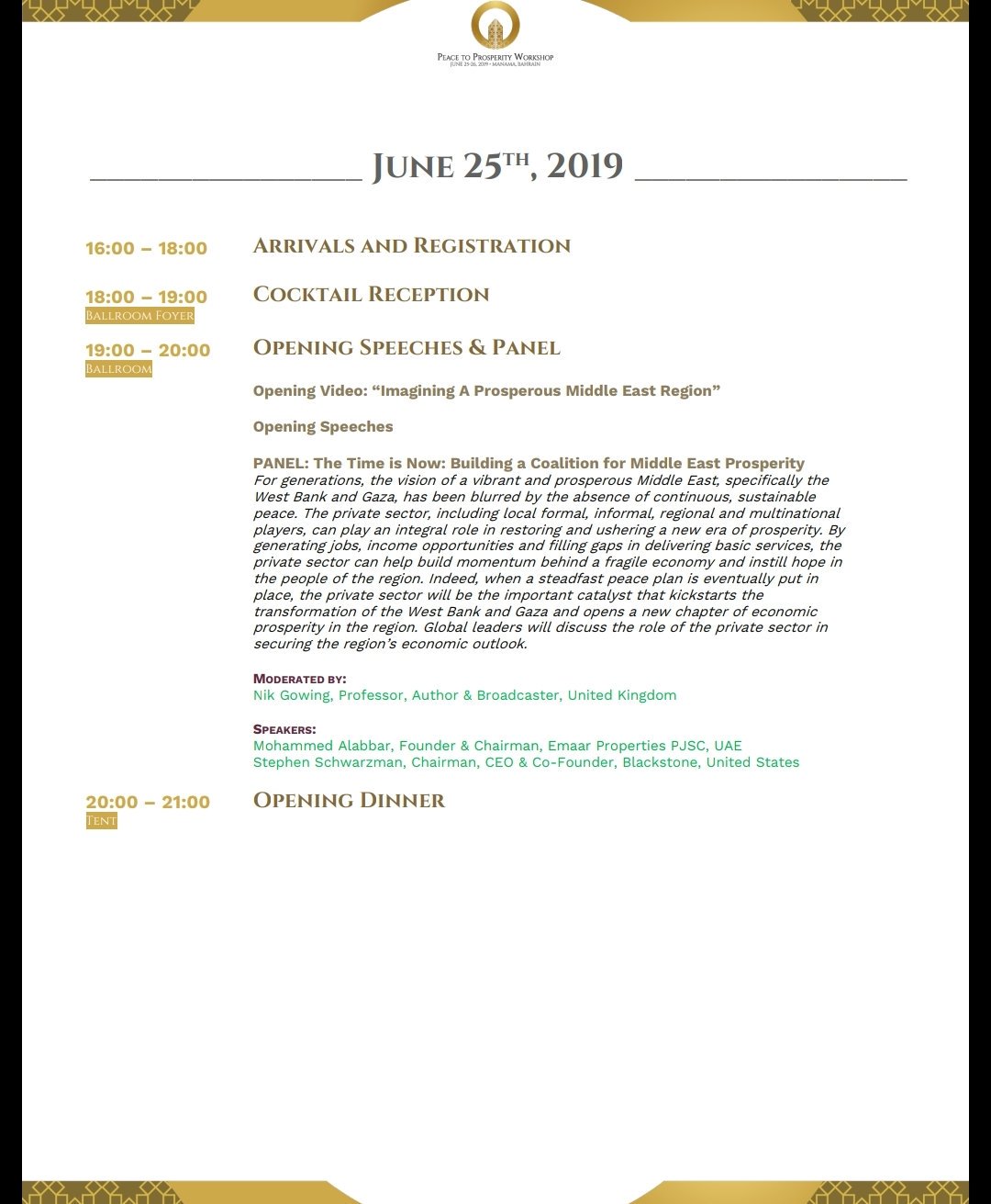 حصل موقع عمان نت على جدول عمل ورشة البحرين الاقتصادية المزمع عقدها في المنامة بتنسيق بحريني أمريكي، في 25 و26 حزيران/ يونيو المقبل تمهيدا لطرح صفقة القرن.