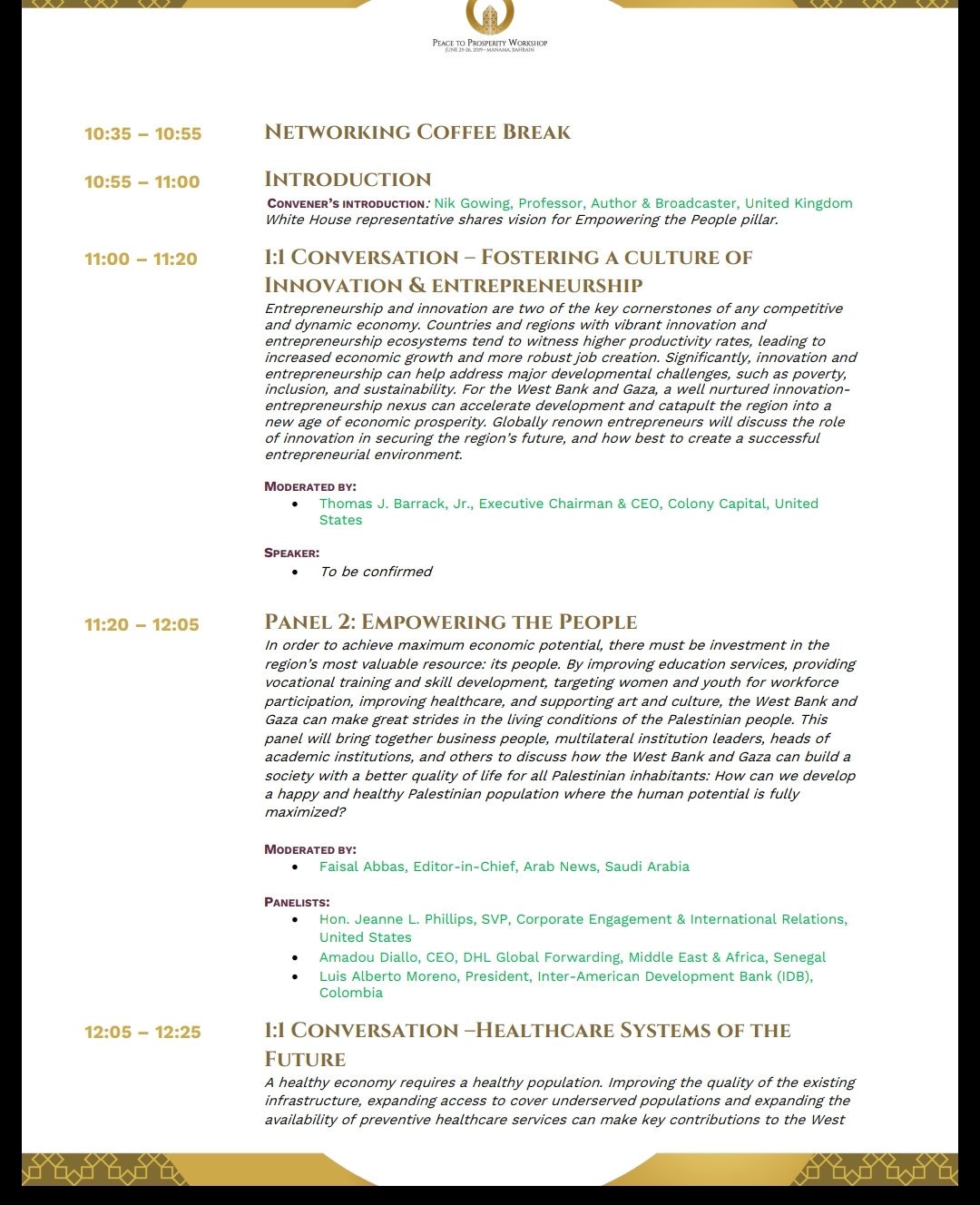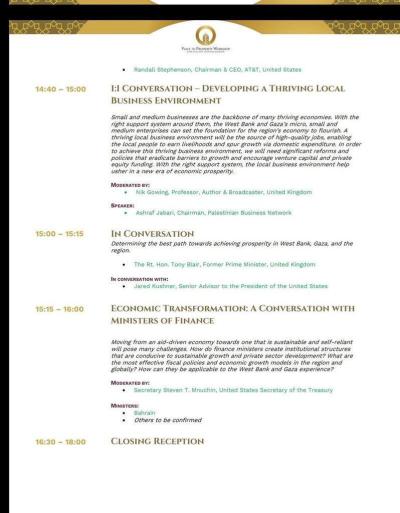 لأجيال فأن رؤية شرق أوسط مزدهر ونابض بالحياة وبالخصوص منطقة الضفة الغربية وغزة تعثر بسبب غياب سلام مستمر وذات إدامه. إن القطاع الخاص بما فيه الرسمي وغير الرسمي واللاعبين من المنطقة ومتعددي الدول يستطيع ان يلعب دورا هاما واساسيا في إعادة وبداية عصر الازدهار. ممكن خلق وظائف وتعزيز فرص زيادة الدخل وملء الفجوات وتقديم الخدمات، فالقطاع الخاص يستطيع ان يخلق قوة دفع لتحسين اقتصاد هش وزرع الامل في نفوس شعوب المنطقة. من المؤكد انه عندما يتم وضع خطة سلام صامدة في مكانها فان القطاع الخاص سيكون قادر بشكل قوي على دفع اقتصاد الضفة والقطاع الى مواقع متقدمة في اقتصاد دول المنطقة. سيناقش قادة عالميون في ضمان الرؤية الاقتصاد للمنطقة.