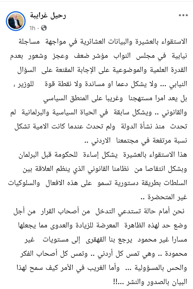 وقال غرايبة إن هذا السلوك يعد مستهجنًا وغريبًا عن المنطقين السياسي والقانوني، ويمثل سابقة في الحياة السياسية والبرلمانية الأردنية لم تشهدها الدولة منذ نشأتها، حتى في الفترات التي كانت فيها نسب الأمية مرتفعة في المجتمع، مؤكدًا أن إدخال العشيرة في نقاش برلماني يسيء للحكومة قبل البرلمان وينتقص من هيبة النظام الدستوري الذي ينظم العلاقة بين السلطات.