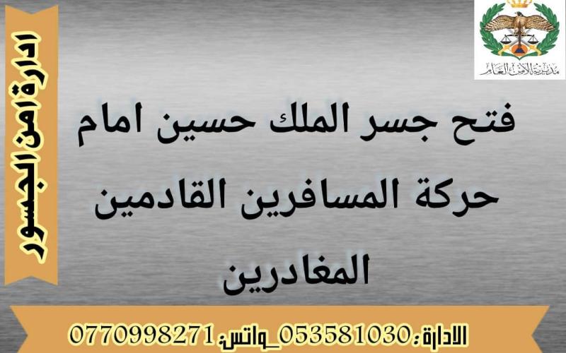 اعلن مساء اليوم عن فتح جسر الملك حسين امام حركة المسافرين القادمين والمغادرين يوم غد الأحد الموافق 21/2/2021 ولاشعار اخر وذلك على النحو التالي: