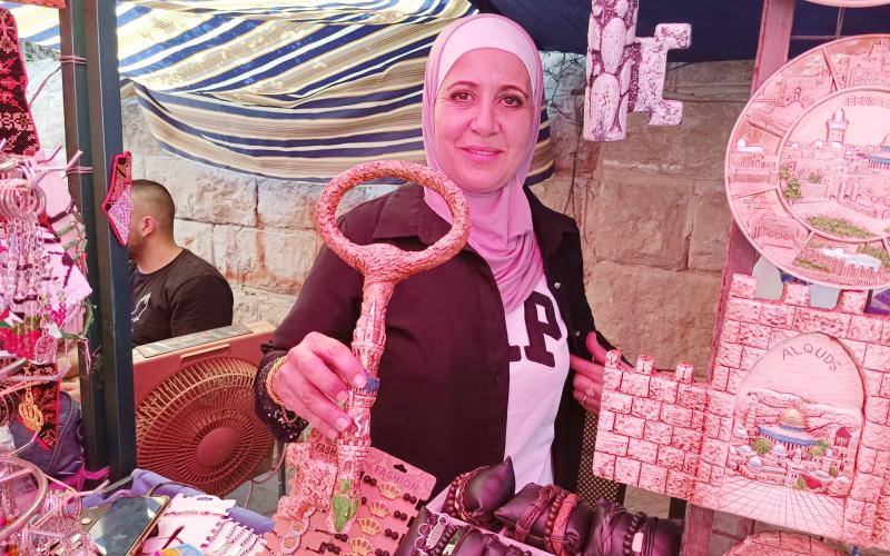 وعلى مدار سنوات قامت السيدة المقدسية بجمع تراب من فلسطين وحمله معها بحقائب السفر لتنحت وتصمم منه لوحات لخارطة فلسطين و وخارطة الأردن و قبة الصخرة ومفاتيح العودة الى جانب رسومات ناجي العلي.