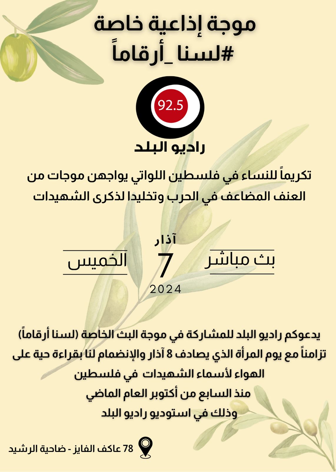 تطلق شبكة الإعلام المجتمعي-راديو البلد موجة بث إذاعية خاصة تحت عنوان #لسنا_أرقاماً يوم الخميس 7 آذار 2024 تزامناً مع يوم المرأة العالمي الذي يصادف 8 آذار.