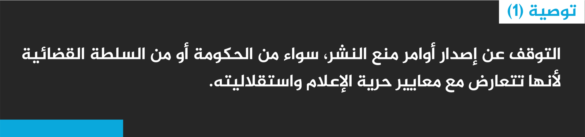 إن أهم الانتهاكات التي وثقها مركز حماية وحرية الصحفيين في عام 2021، كانت متعلقة بأنظمة الإعلام وبأوامر منع النشر، على نحو منع النشر في القضية التحقيقية المقامة من قبل المجلس الأعلى للأشخاص ذوي الإعاقة على أحد المراكز الذي يُعنى بالحالات الخاصة، ومنع النشر في قضية "الفتنة"، ومنع النشر في قضية نقابة المعلمين، وكذلك منع النشر في الدعوى القضائية المتعلقة بعائلة رئيس الوزراء د. بشر الخصاونة.