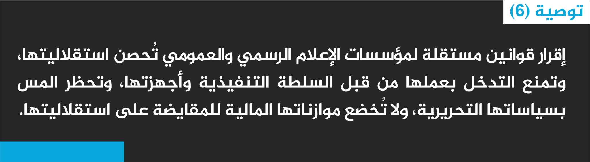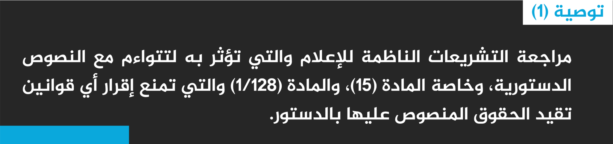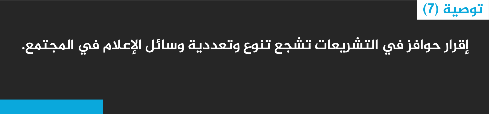 ولم يطرأ أي جديد سنة 2021 على الاشتراطات التي تمثل قيودا على ترخيص وسائل الإعلام كالصحف الورقية أو المواقع الإلكترونية والإذاعات التي لا يمكن السماح لها بالبث دون ترخيص مسبق، مما أبقى هذا القيد قائما وممتدا على الاستثمار في صناعة الإعلام.
