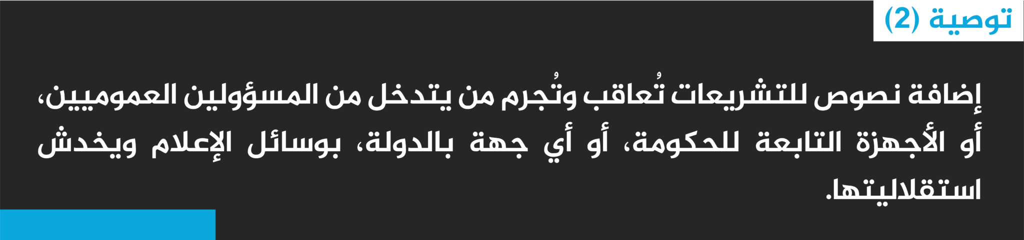 لم يصدر هذا العام أي قرار بالتعويض المالي ضد الصحفيين إلا أن تغليظ العقوبات في التعويض المدني على الصحفيين وحتى المواطنين الذين ينشطون على شبكات التواصل الاجتماعي أدى وسيؤدي إلى المزيد من الرقابة الذاتية، وسيؤدي إلى انخفاض منسوب النقد الموضوعي للمسؤولين العموميين وللشخصيات العامة، ولم يشرع أي قانون يمنع التدخل في عمل وسائل الإعلام، كما أنه لا يوجد أي تشريع يحمي الصحفي من مقاضاة من يقوم بانتهاك حقه وحريته في النشر، بما في ذلك الدستور نفسه الذي لم ينص على توفير مثل هذه الحماية.