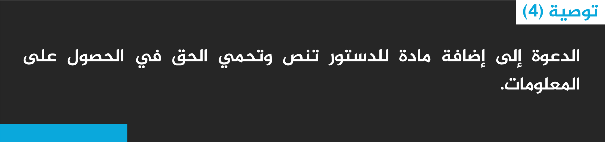 إن أبرز ما شهدته سنة 2021 تشكيل اللجنة الملكية لتحديث المنظومة السياسية، وبخلاف التوقعات فقد تجاهلت اللجنة تماما إضافة أي نص دستوري مقترح لدسترة ضمان حق الحصول على المعلومات.