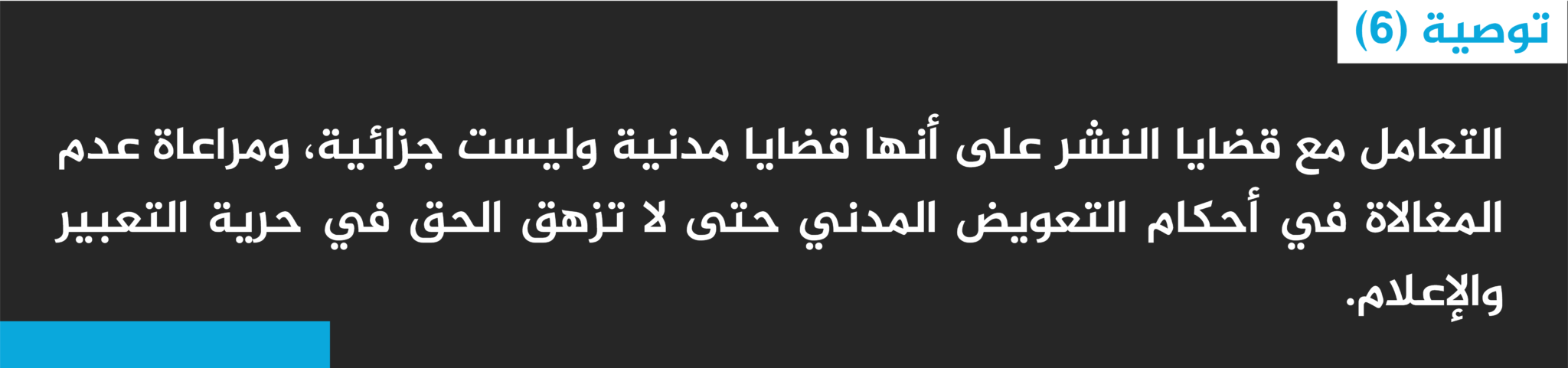 ويرى القاضي السابق، محمد الطراونة، أن الملاحقة في قضايا النشر والقضايا الإعلامية في الآونة الأخيرة تزايدت نتيجة التدخلات الداخلية والخارجية، والقوانين الفضفاضة، بينما يشير د. صخر الخصاونة إلى أن إشكالية التعويض المدني تكمن في أسس التعويض المعتمد عليها لدى الخبراء، فيما دعا القاضي السابق والمحامي، لؤي عبيدات إلى وضع سقوف عليا للتعويض المدني في قضايا المطبوعات والنشر، ومنح صلاحيات للقضاء بأن يرد التقارير أو إنقاص قيمة التعويض بما يراه مناسبا.