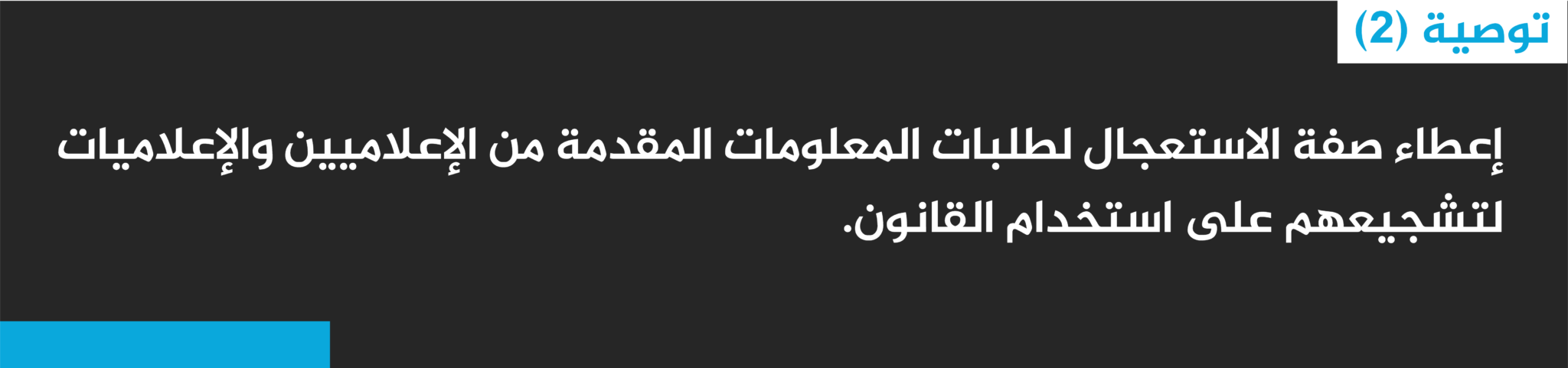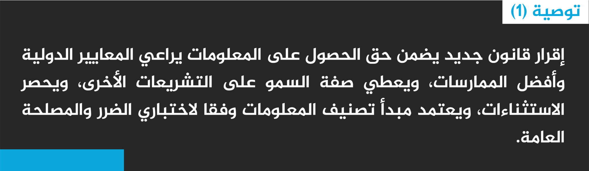 خلال عام 2021 لم يصدر عن الحكومة ما يشير إلى إحداث أي تغيير أو تعديل على تطبيقات القانون في الإدارة العامة، وفي الوقت الذي لا يزال مشروع القانون المعدل لقانون ضمان حق الحصول على المعلومات في أدراج مجلس النواب، فإن الحكومة أيضا ومجلس المعلومات لم يفصحا عن أي معلومات حول تطبيق القانون.