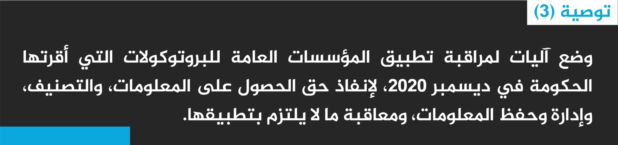 ومما توجب الإشارة إليه أن الحكومة وفي ديسمبر عام 2020 أقرت ثلاثة بروتكولات لإنفاذ القانون تمثلت في وضع دليل إرشادي لمأسسة إجراءات حق الحصول على المعلومات، وهو خارطة طريق ملزمة لكل المؤسسات العامة، والثاني عن تصنيف المعلومات، والثالث عن إدارة المعلومات وطريقة حفظها وأرشفتها واستعادتها.