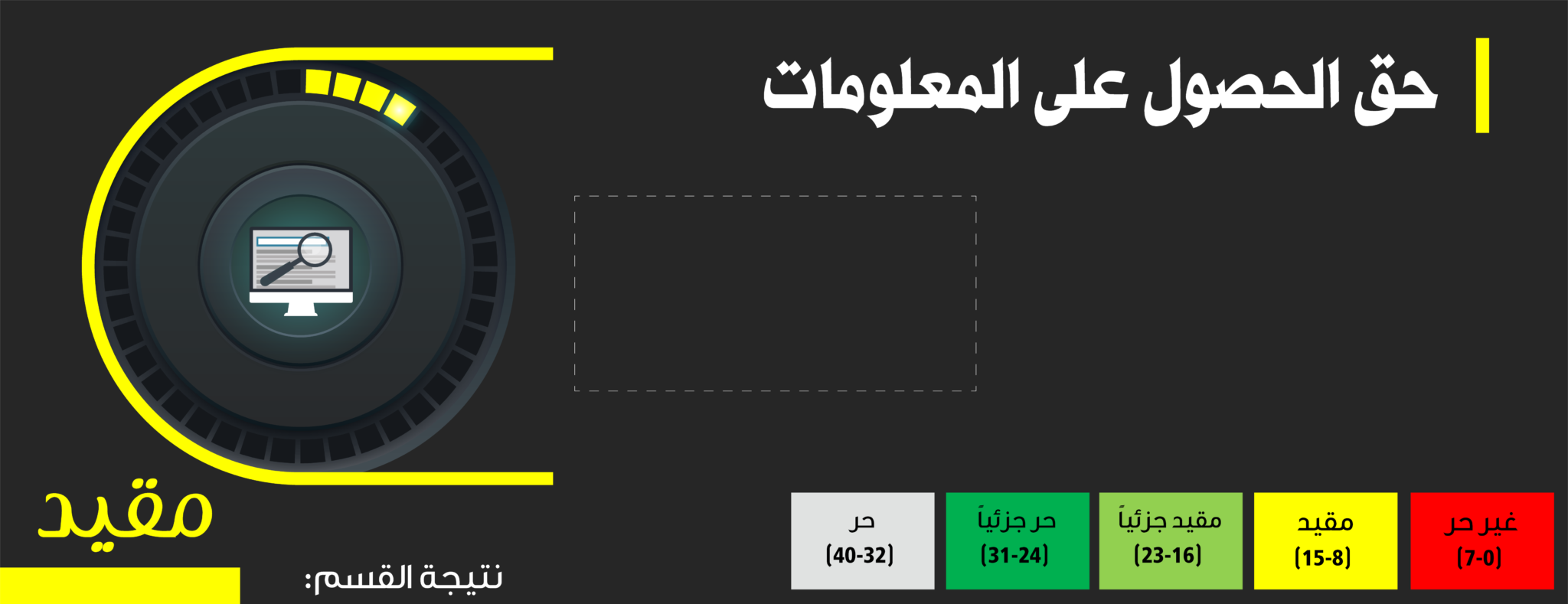 حافظ قسم حق الحصول على المعلومات على تصنيف "مقيد" للعام الثاني على التوالي بحصوله على (9.8) نقطة بالرغم من تراجعه نقطة واحدة هذا العام قياسا بسنة 2020. يتناول هذا القسم قانون ضمان حق الحصول على المعلومات، لمعرفة إن كان قد تعرض القانون وتطبيقاته إلى أي جديد طيلة سنة 2021 ضمن إطار أربعة أسئلة رئيسية، إلى أي مدى تطبق الحكومة والمؤسسات العامة قانون ضمان حق الحصول على المعلومات بشكل فعال؟ وهل هناك معايير معلنة وشفافة لتصنيف المعلومات في المؤسسات العامة؟ وإلى أي مدى توفر المواقع الإلكترونية للمؤسسات العامة المعلومات للجمهور والصحفيين بشكل كافٍ؟ وإلى أي مدى تعمل الحكومة على إتاحة المعلومات بصورة استباقية؟