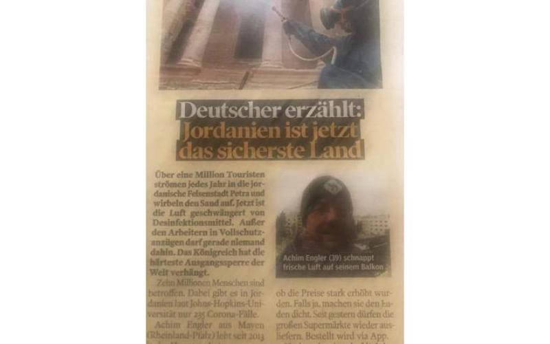 تقول صحيفة Bild Zeitung الألمانية : الأردن الآن هو البلد الأكثر أمانًا ، حيث يتوافد أكثر من مليون سائح على مدينة البتراء الصخرية الأردنية كل عام ويقذفون الرمال.