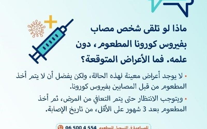 وأضافت الوزارة في ردها على أحد الاستفسارات، "ماذا لو تلقى شخص مصاب بفيروس كورونا المطعوم، دون علمه. فما الأعراض المتوقعة؟"، أنه لا يوجد أعراض لذلك، ويتوجب الانتظار حتى يتم التعافي من المرض ثم أخذ المطعوم بعد 3 شهور على الأقل من تاريخ الإصابة.