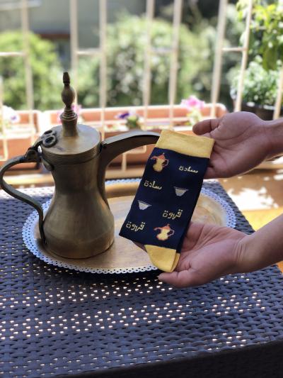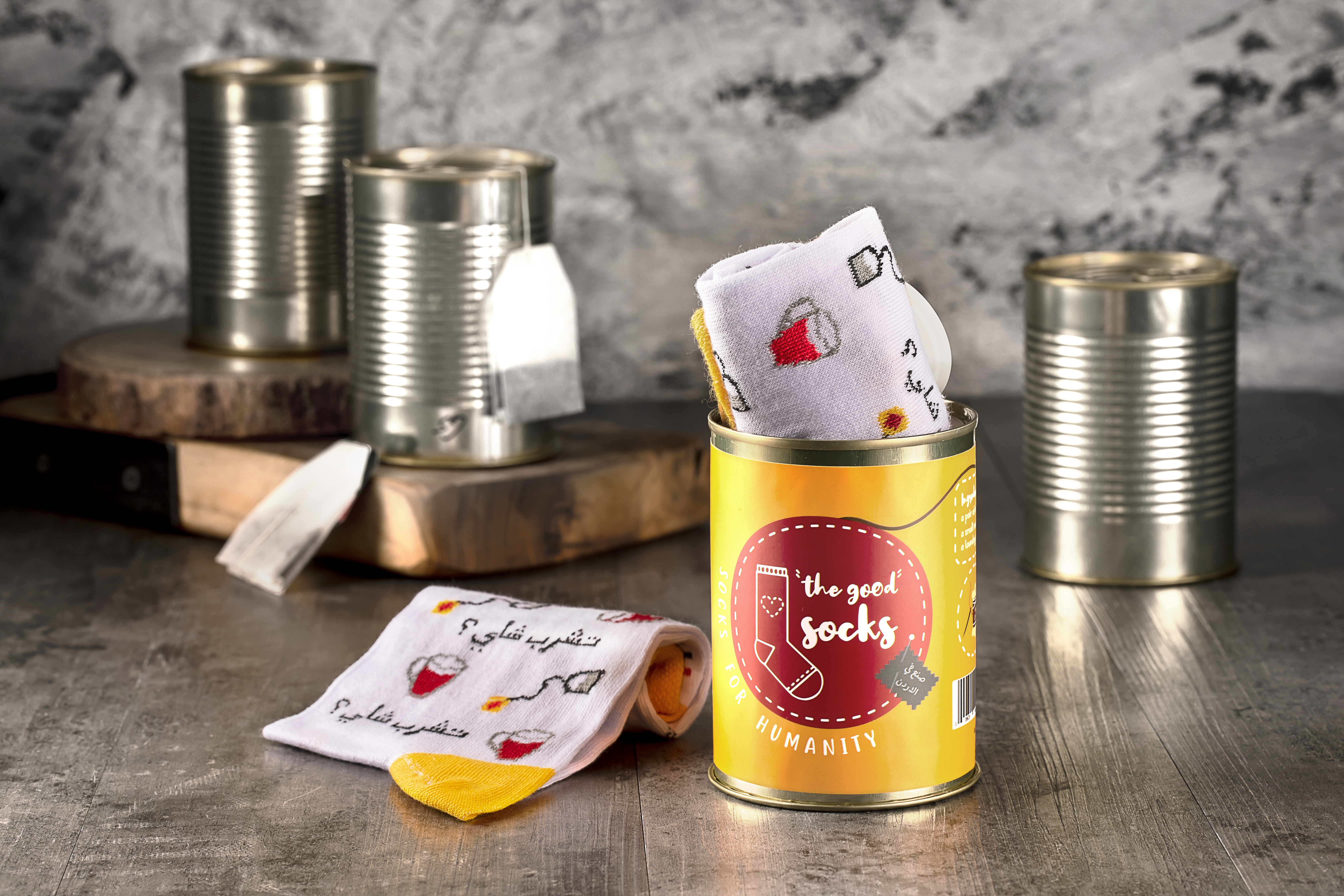 ولم تخلو الجوارب المعلبة من عبارات كالحب، واخرى دارجة في الثقافة الشعبية الأردنية مثل "تشرب شاي؟".